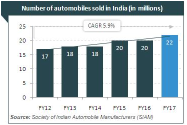 The automobile industry is supported by various factors such as availability of skilled labour at low cost, robust R&D centres and low cost steel production. The industry also provides great opportunities for investment and direct and indirect employment to skilled and unskilled labour. The Indian automotive aftermarket is estimated to grow at around 10-15 per cent to reach US$ 16.5 billion by 2021 from around US$ 7 billion in 2016. It has the potential to generate up to US$ 300 billion in annual revenue by 2026, create 65 million additional jobs and contribute over 12 per cent to India’s Gross Domestic Product